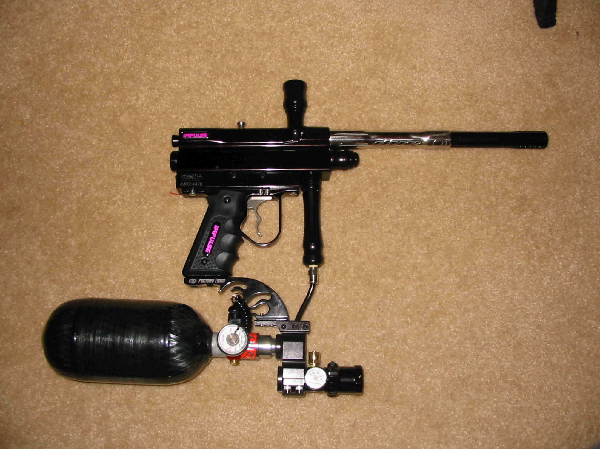Smart Parts 2k2 impulse with a 12" progressive barrel, 12" dye boomstick, CP flame drop forward, black impulse gel grips, 12v revy with x-board,68ci/4500psi crossfire nitro tank.