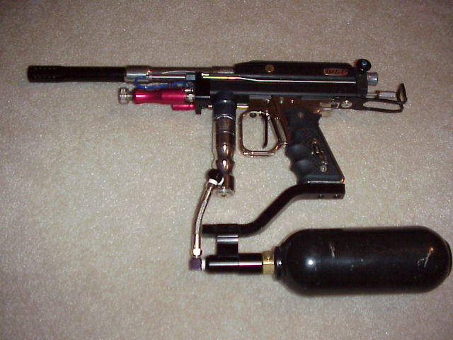 2000 AUTOCOCKER WITH A DYE BOOMSTICK, DYE BOLT, PMI REGULATOR, DROP FORWARD, ANS FRONT END, WGP HINGE TRIGGER FRAME, DYE STICKY GRIPS. 114/3000 Air America Raptor Nitrogen Tank. |